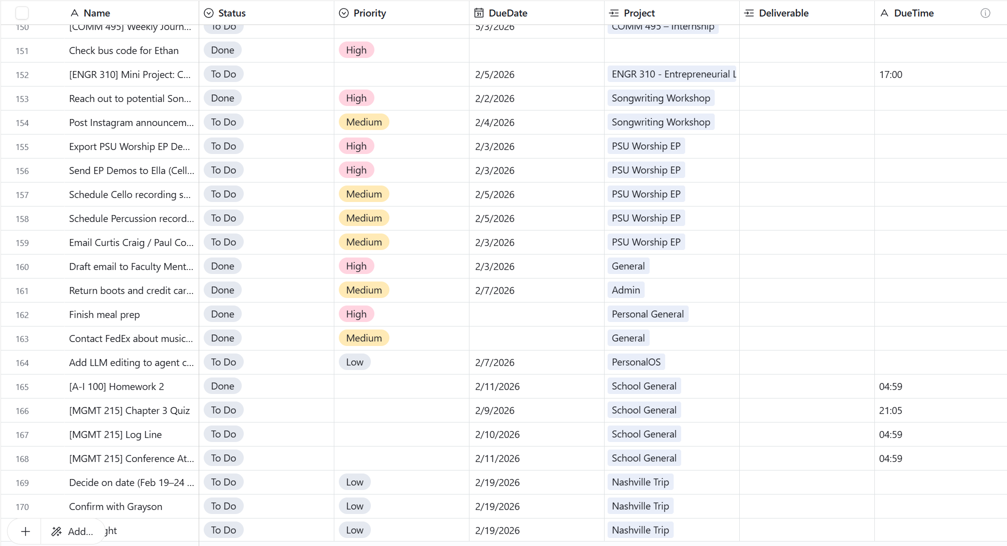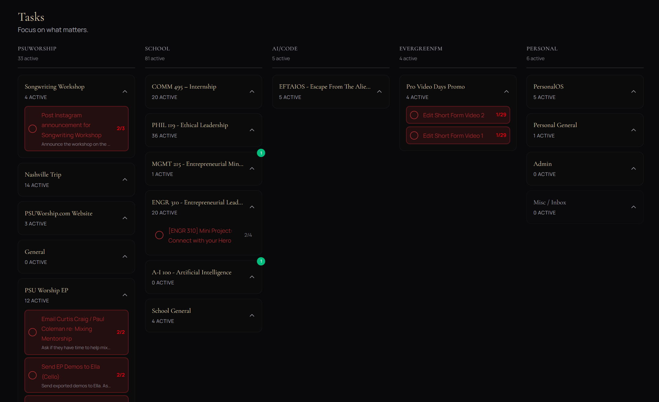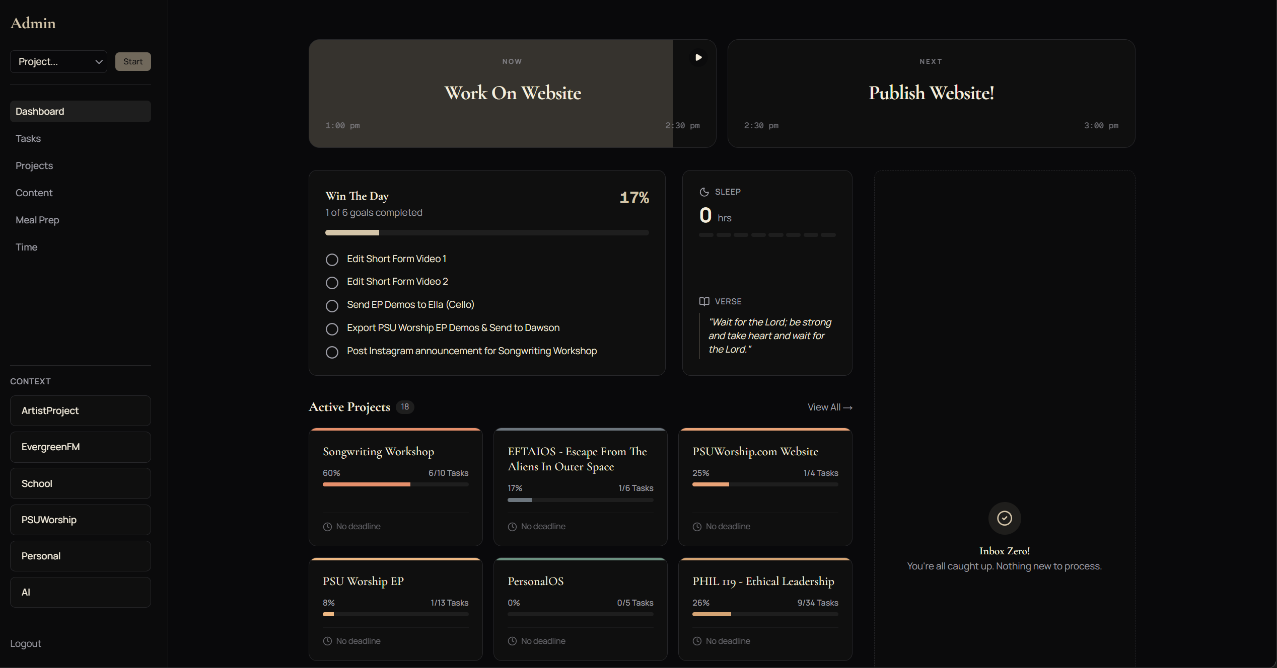Reflection PersonalOS is my unified command center for school, creative work, admin, and content. A local AI agent understands my projects and goals, and I can message it from my phone or inside the website.