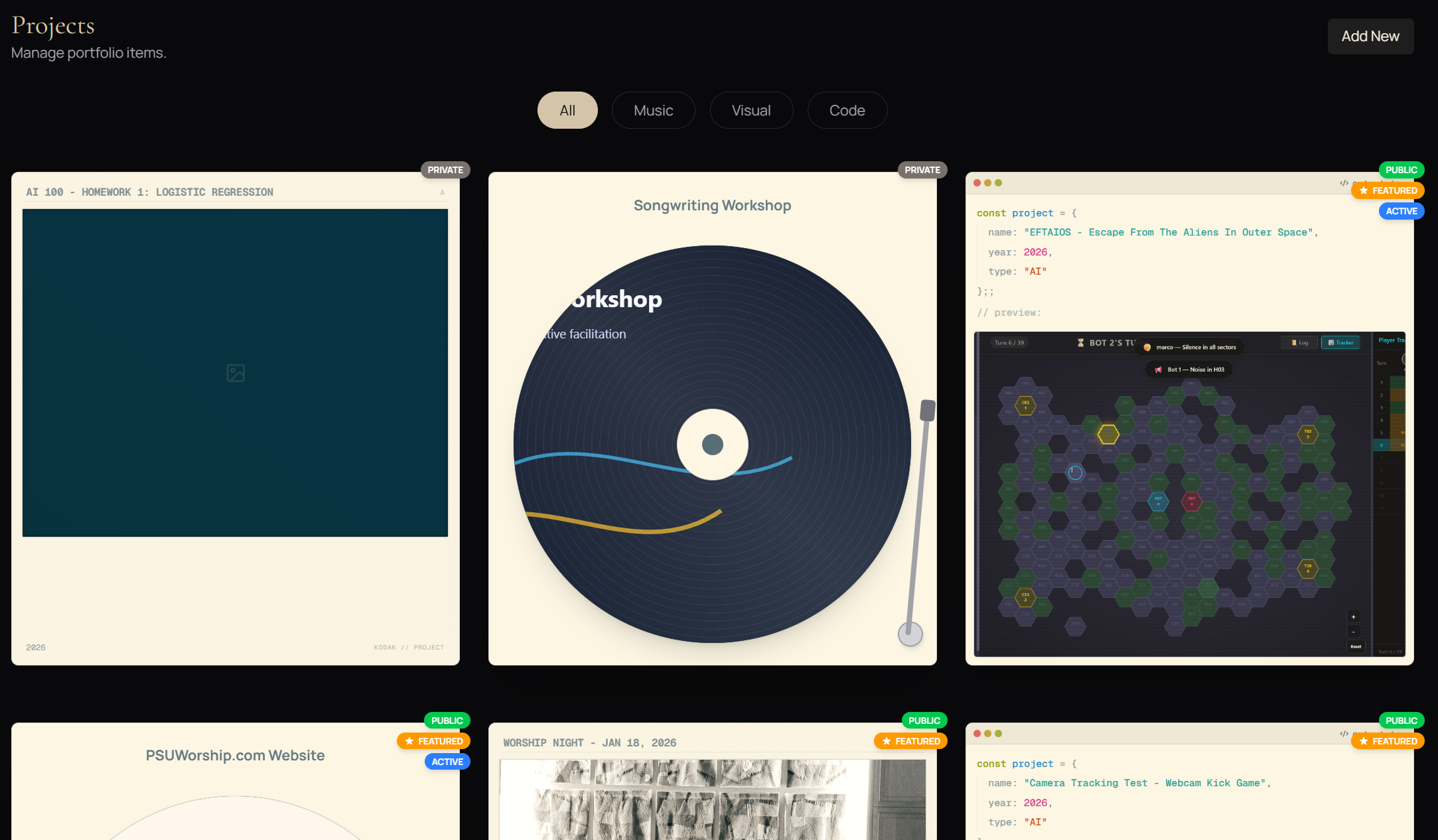 Admin control + publishing pipeline I can set public/featured status, edit content, and manage projects from the admin view.